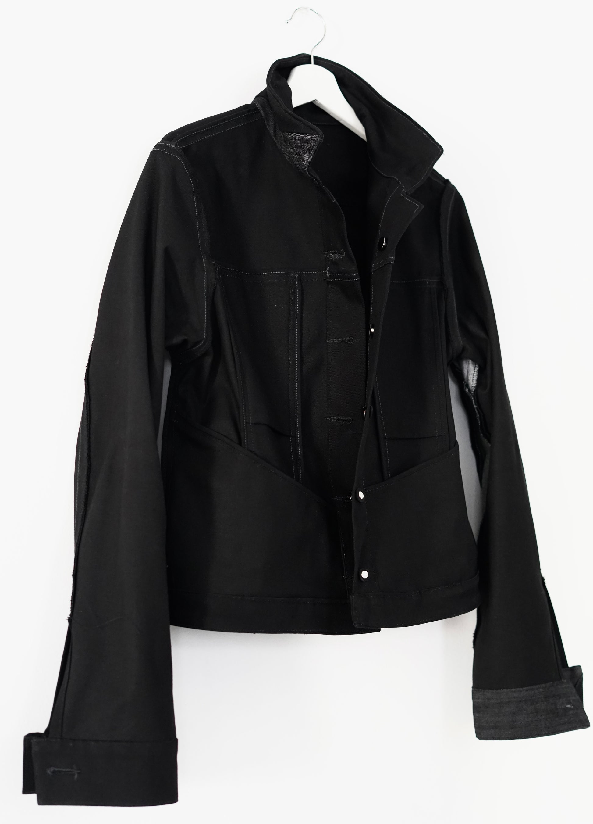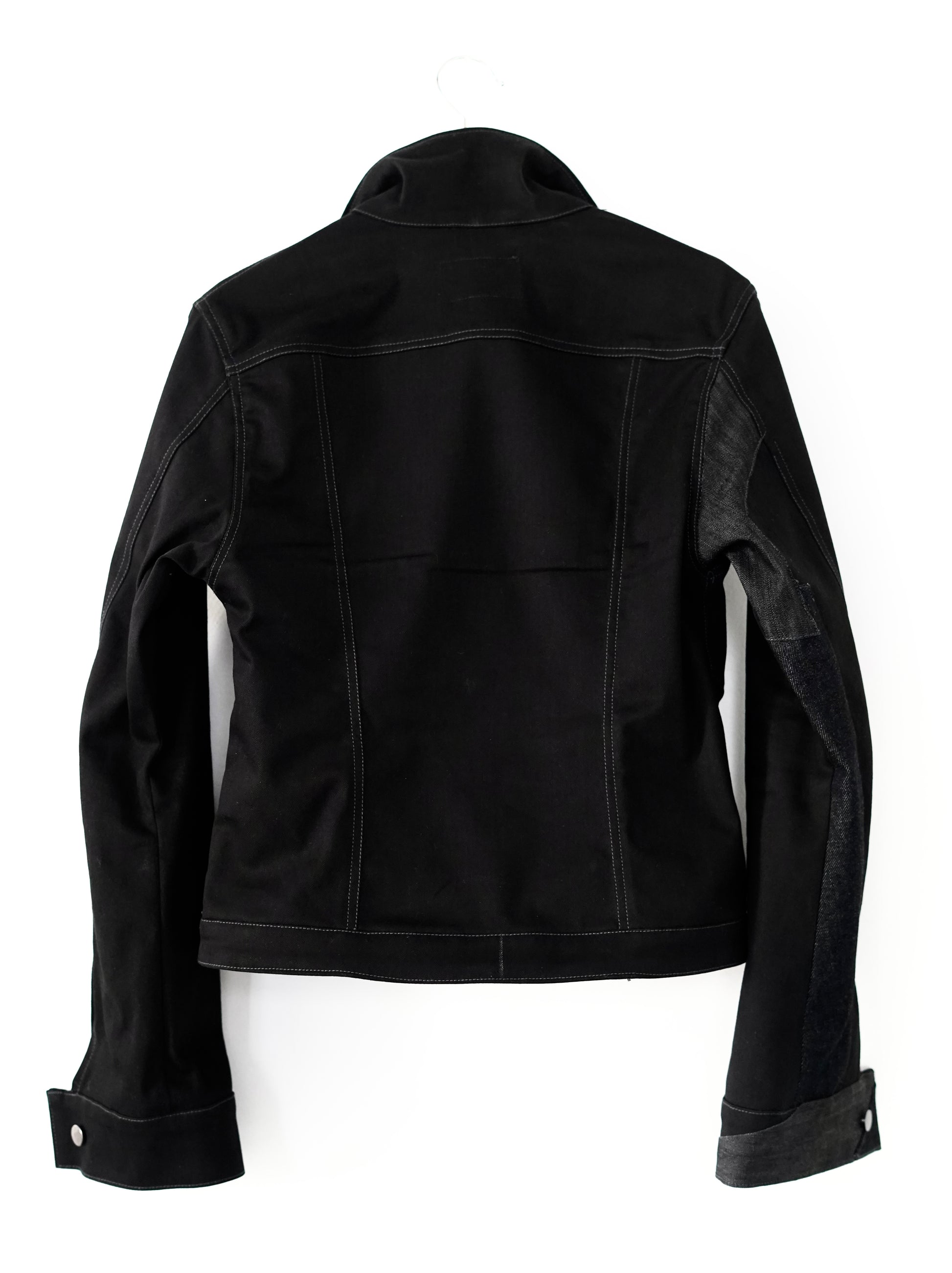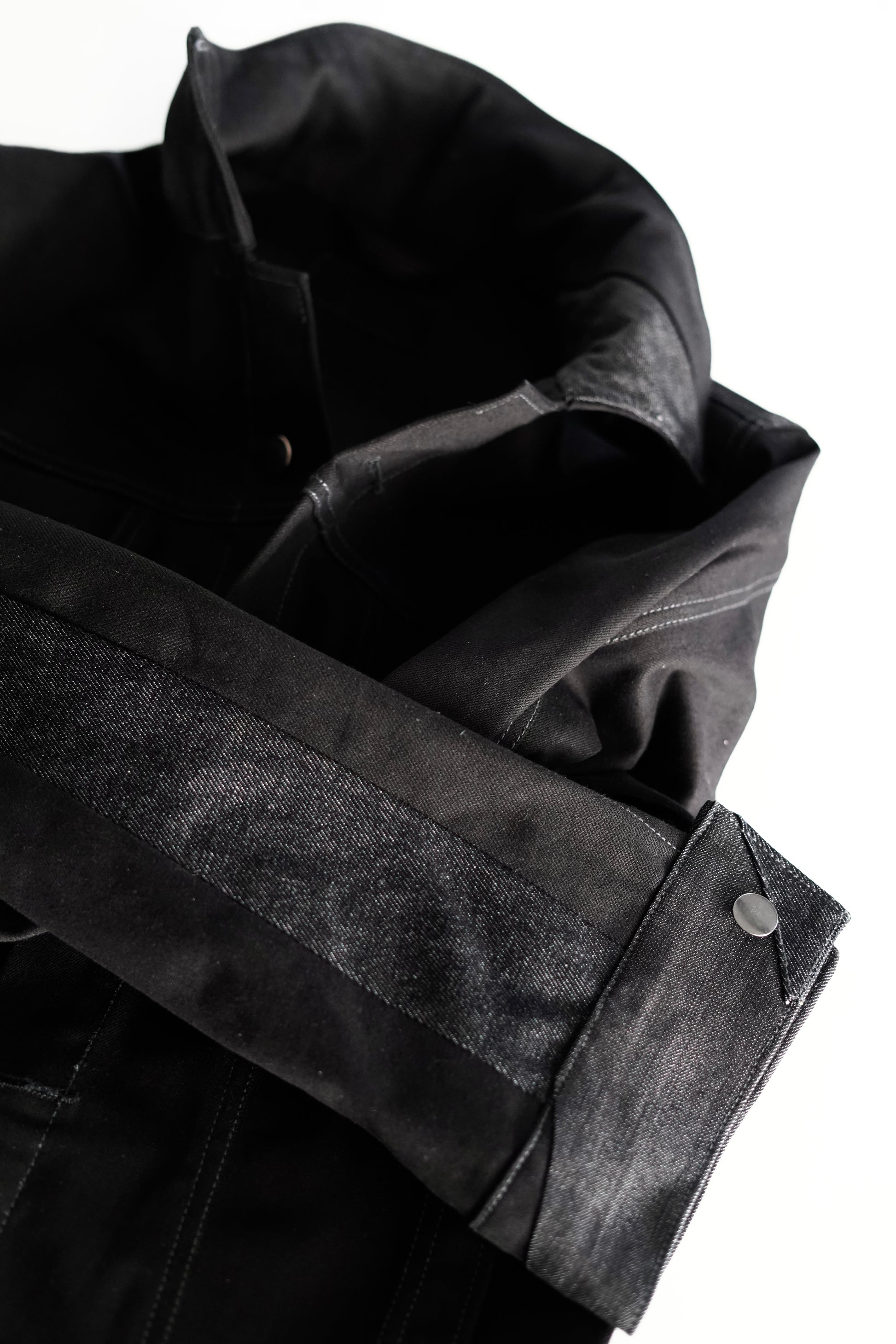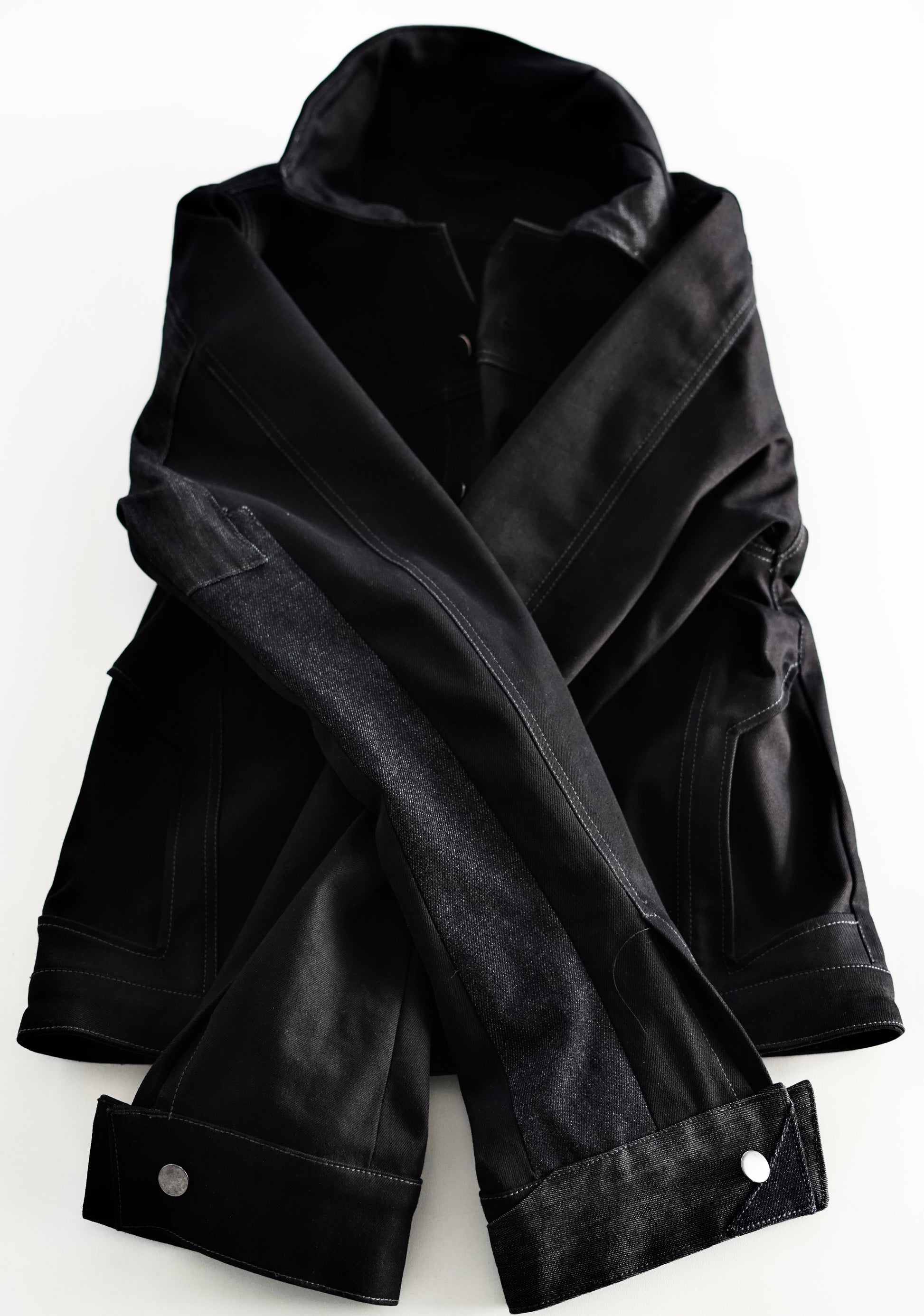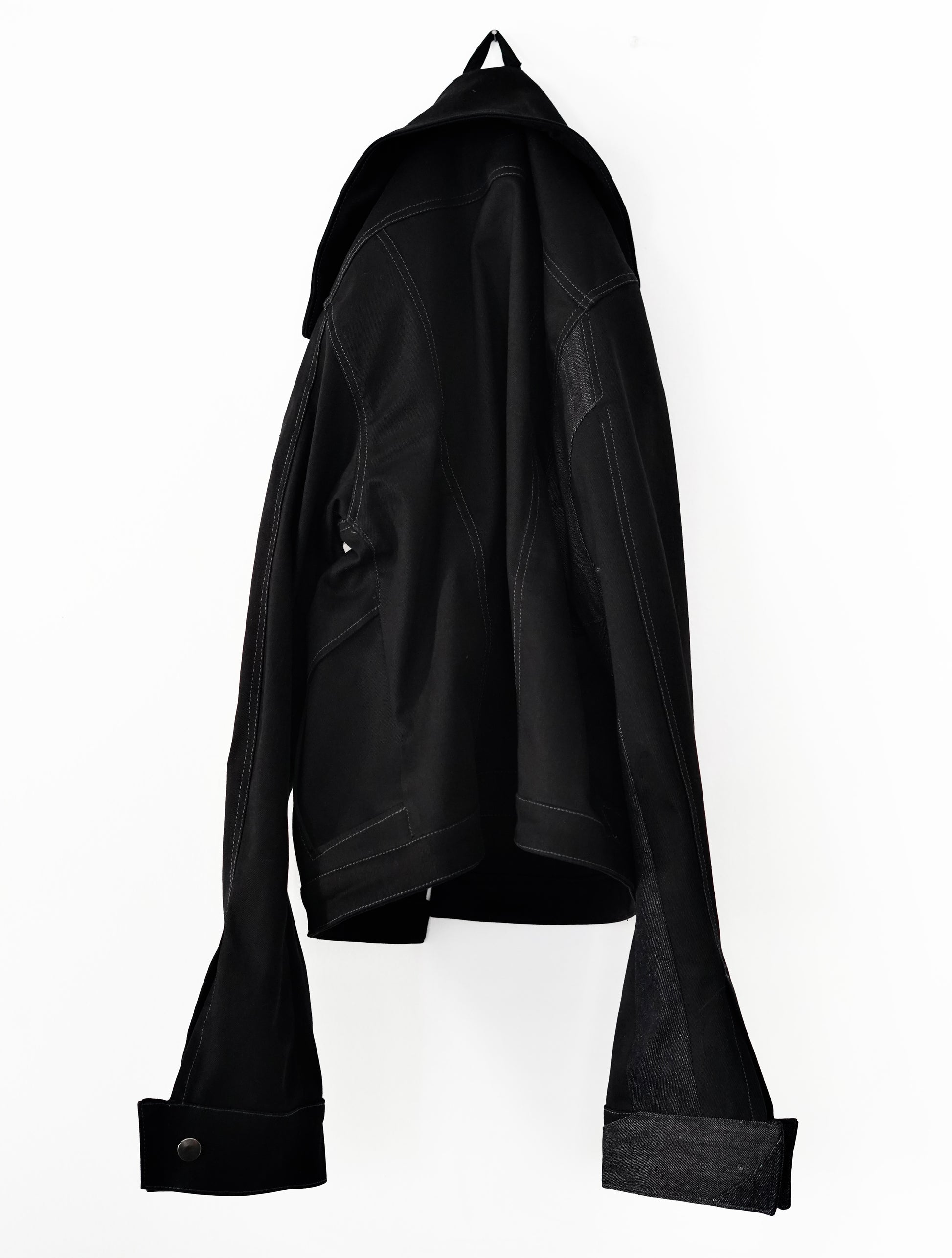 Redefined classic with edge. Designed with a tailored silhouette, balancing structure and movement, featuring a mix of denim textures for subtle contrast. The structured collar holds its shape or bends to your preference.